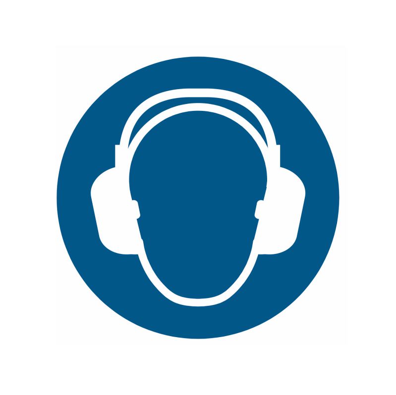 Gehoorbescherming verplicht Verkrijgbaar als high tack sticker of op aluminium (1 mm dik) in verschillende maten.