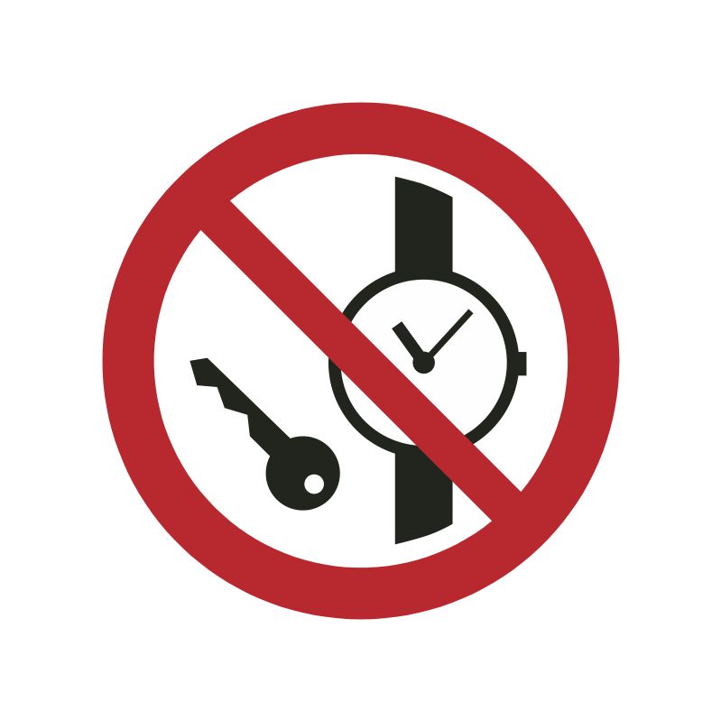 Metalen voorwerpen en horloges verboden Verkrijgbaar als high tack sticker of op aluminium (1 mm dik) in verschillende maten.