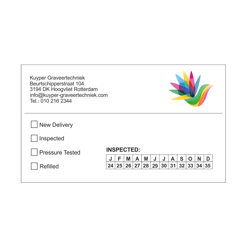 De keuringslabels worden gedrukt op vinyl, zijn waterproof en gaan lang mee. Onze rechthoekige keuringslabels zijn verkrijgbaar in verschillende maten vanaf 100 stuks. Wil je een ander ontwerp of kleur? Neem dan contact op.