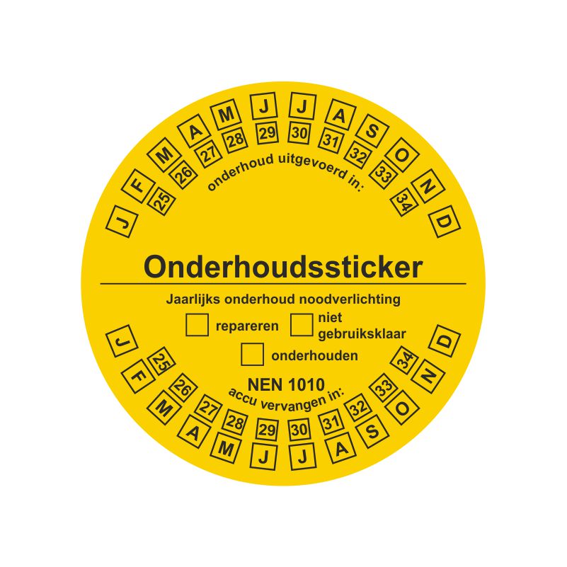 Deze onderhoudssticker voor noodverlichting is verplicht voor verzekering, brandweer en milieudiensten.De keuringsstickers worden gedrukt op vinyl, zijn waterproof en gaan lang mee. Ze worden geleverd op strips per 5 stuks, te bestellen per 100 of 1000 stuks. Onze ronde keuringslabels zijn verkrijgbaar in verschillende maten en soorten. Neem gerust vrijblijvend contact op.